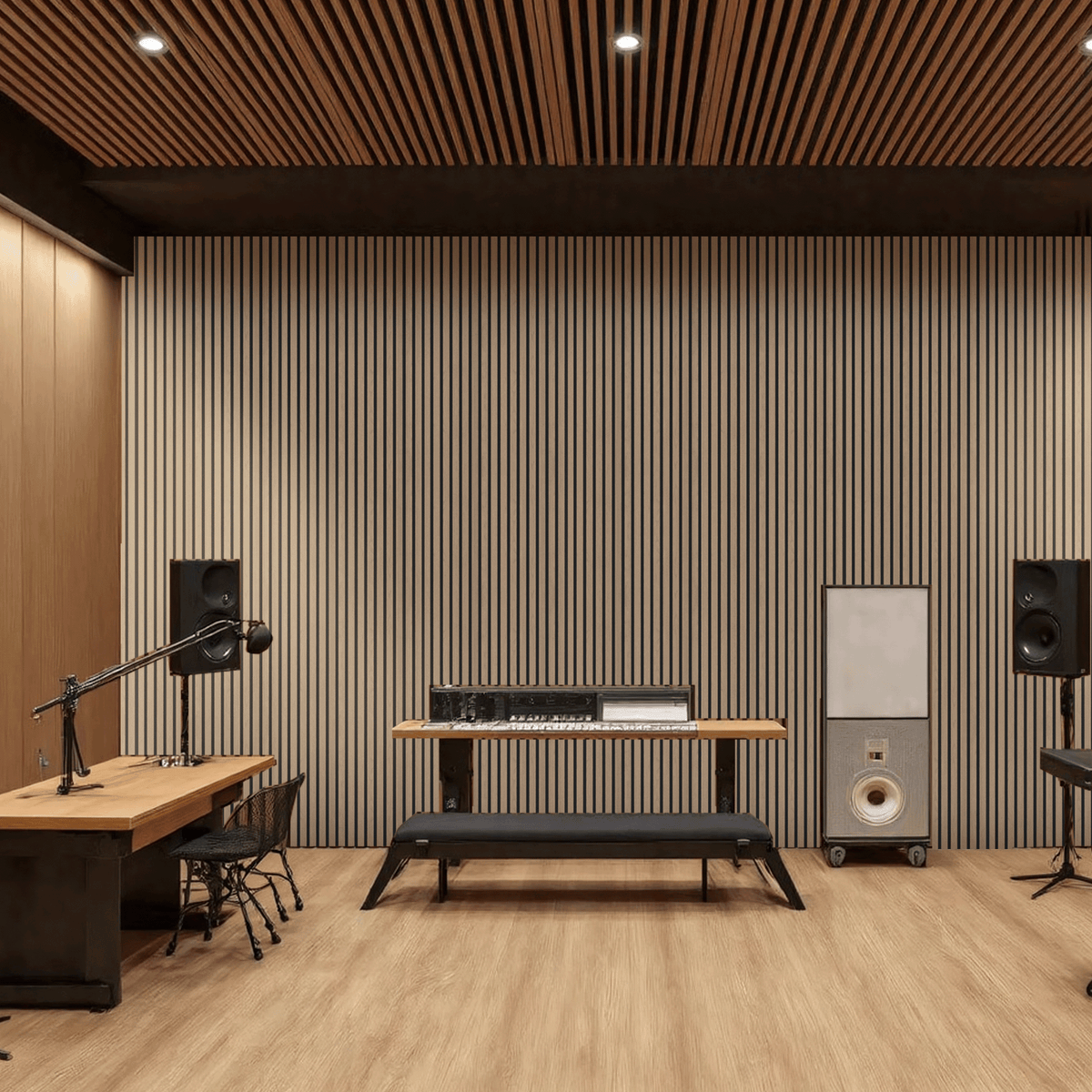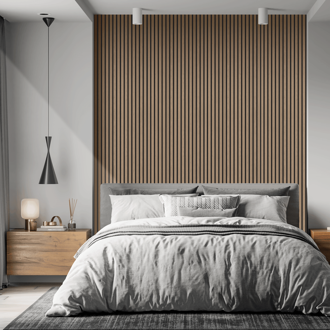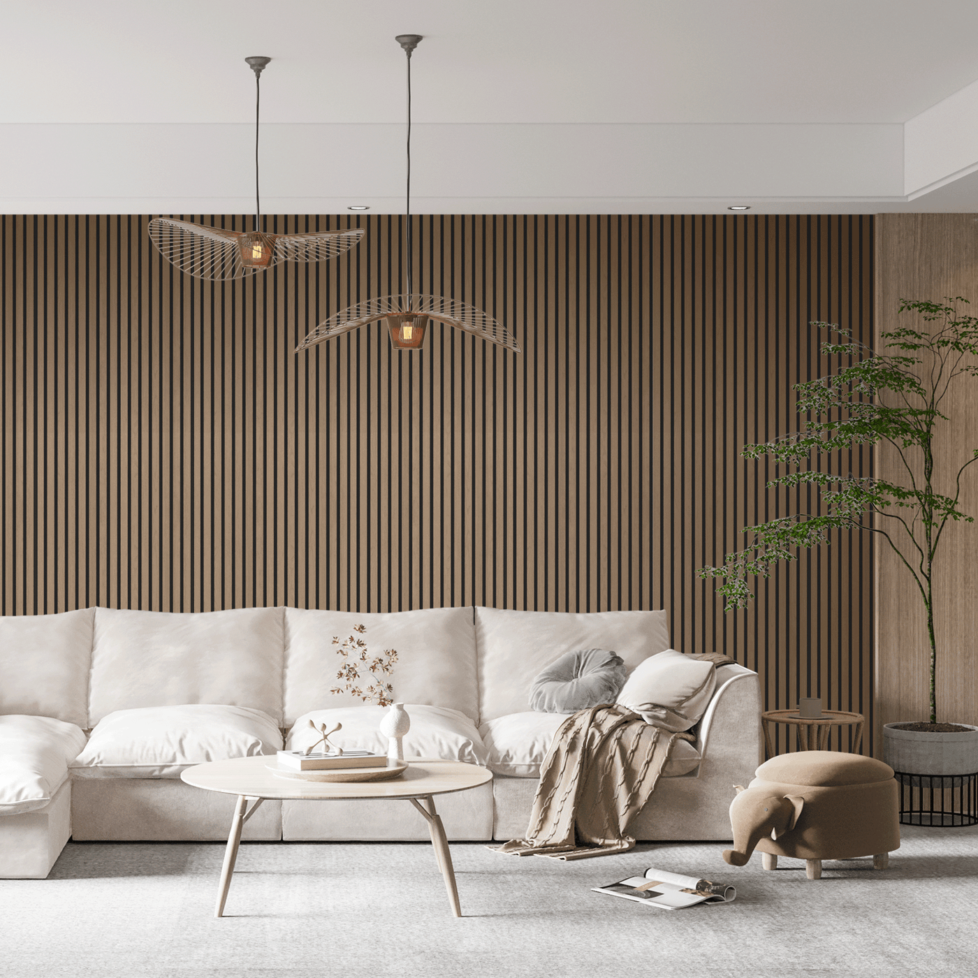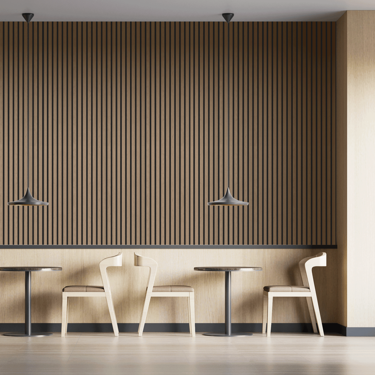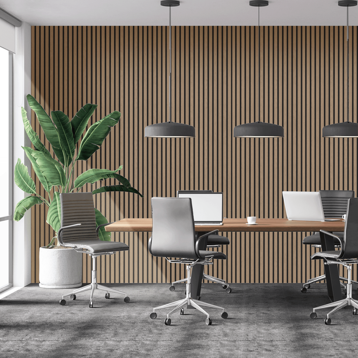 Met een natuurlijke houtfineerafwerking op MDF-latten en een duurzame, akoestische viltachterzijde biedt dit paneel een verfijnde look én een effectieve vermindering van galm en echo voor een prettige akoestiek.